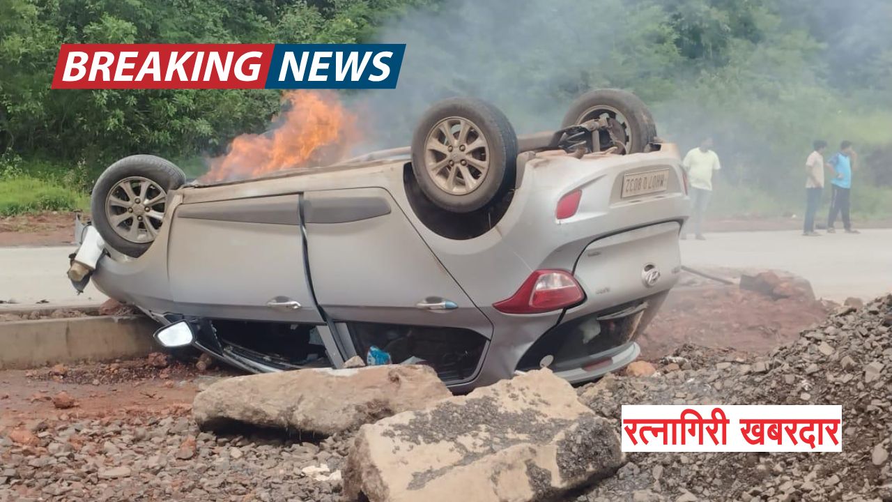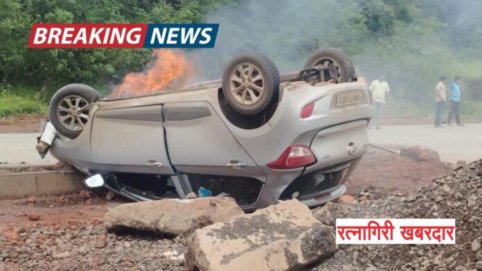 रत्नागिरी : सिंधुदुर्गहून रत्नागिरीकडे येत असताना रस्त्यावरील कामामुळे केलेल्या मार्गातील बदलाचा फलक न दिसल्याने एक कार थेट कठड्याला धडकून पलटी झाली आणि क्षणातच गाडीने पेट घेतल्याची धक्कादायक घटना रत्नागिरी-पाली मार्गावरील हातखंबा टॅपजवळ आज दुपारच्या सुमारास घडली. या भीषण अपघातात गाडीतील डॉक्टर वडील आणि त्यांची लहान मुलगी दैव बलवत्तर म्हणून आश्चर्यकारकरित्या बचावले आहेत. या घटनेमुळे सार्वजनिक बांधकाम विभागाच्या कामकाजावर प्रश्नचिन्ह निर्माण झाले असून, प्रवाशांच्या सुरक्षेसाठी तात्काळ स्पष्ट सूचना फलक लावण्याची मागणी जोर धरू लागली आहे.