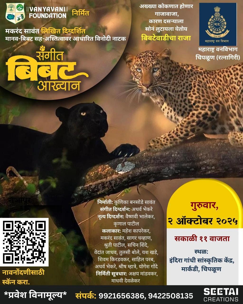 चिपळूण : भारताच्या नाट्यपरंपरेत मैलाचा दगड ठरलेले, देशातील पहिले वन्यजीव नाटक म्हणून लौकिक मिळवलेले ‘संगीत बिबट आख्यान’ हे धमाल विनोदी नाटक २ ऑक्टोबरला सकाळी ११ वाजता चिपळूण येथील इंदिरा गांधी सांस्कृतिक केंद्रात सादर होणार आहे. निसर्ग आणि मानवी सहजीवनाचा एक अदृश्य अध्याय उलगडणारे हे नाटक, केवळ मनोरंजकच नव्हे तर विचारप्रवर्तक अनुभव देईल. संगीत बिबत आख्यान हे केवळ एक नाटक नाही, तर ते वन्यजीवनाचे एक जिवंत चित्रण आहे.