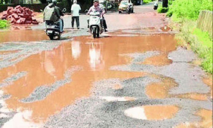रामपूर : मार्गताम्हाणे (ता. चिपळूण) पद्मावती मंदिर नदीवरील पुलावर खड्डेच खड्डे पडले आहेत. पावसामुळे खड्ड्यांमध्ये पाण्याची डबकी तयार झाली आहेत. ठेकेदाराने निष्कृष्ट केलेल्या कामाचा भाग असून खड्डे, डबक्यामुळे हा मार्ग मृत्यूचा सापळा बनला आहे. या मार्गावरून धोकादायकरीत्या प्रवास सुरू आहे. त्यामुळे तातडीने रस्ता दुरूस्त करावा, अशी मागणी होत आहे.