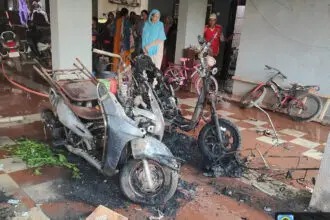 दापोली : दापोली शहरातील फॅमिली माळ परिसरात शुक्रवारी सकाळी भीषण आग लागल्याने परिसरात एकच खळबळ उडाली. ही घटना नूर मंजिल गल्लीतील आयशा प्लाझा कॉम्प्लेक्स येथे घडली असून, या आगीत दोन दुचाकी पूर्णपणे जळून खाक झाल्या तर आणखी पाच दुचाकींचे मोठ्या प्रमाणात नुकसान झाले आहे.