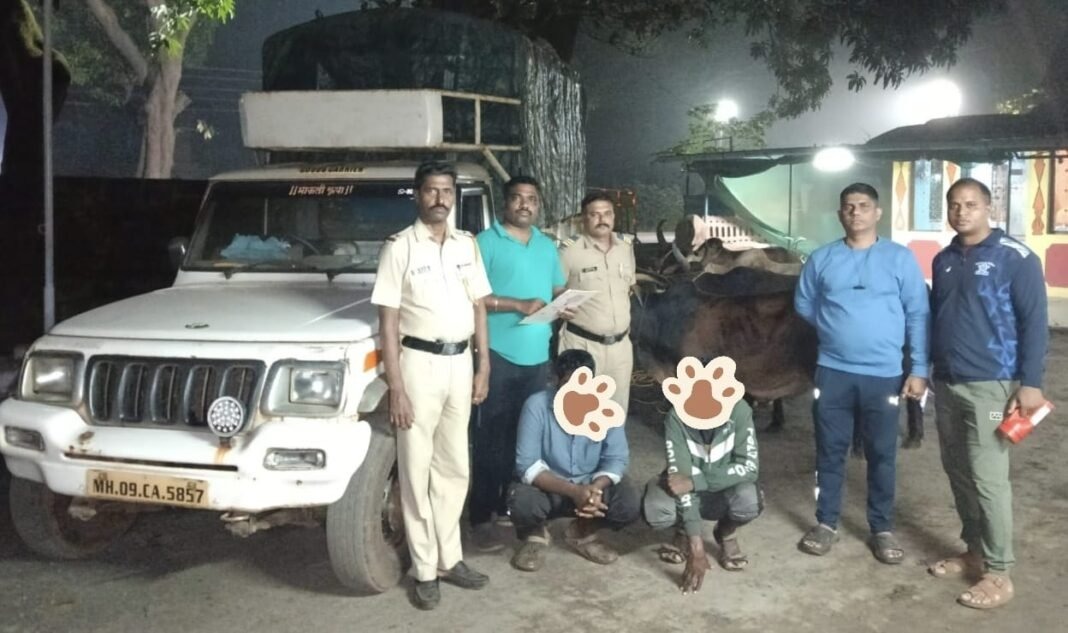 देवरुख : निवधे कळकदरा मार्गावरील धनगरवाडी येथे रविवारी (दि. १२ ऑक्टोबर) पहाटे ३.३० वाजण्याच्या सुमारास बैलांची बेकायदेशीर वाहतूक करणाऱ्या कोल्हापुरातील दोघांना देवरुख पोलिसांनी गाडीसह ताब्यात घेतले. अल्ताफ सरदार मुलाणी (वय २६, रा. कोडोली, ता. पन्हाळा, जि. कोल्हापूर) आणि पांडुरंग कोंडिबा लांबोरे (वय ३२, रा. शाहुवाडी, जि. कोल्हापूर) अशी ताब्यात घेतलेल्या दोघांची नावे आहेत.