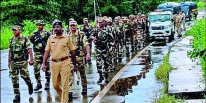 लांजा : निवडणूक पार्श्वभूमीवर लांजा तालुक्यातील कोर्ले बाजारपेठ ते भांबेड बाजारपेठ परिसर येथे सीआयएसएफचे ५० जवान तसेच लांजा पोलीस ठाण्यामधील पोलिस अंमलदार यांच्यावतीने पोलीस निरीक्षक नीळकंठ बगळे यांच्या मार्गदर्शनाखाली ‘रूट मार्च’ काढण्यात आला. रूट मार्च पूर्ण झाल्यानंतर ही प्लाटून पूर्णगडसाठी रवाना करण्यात आली आहे.