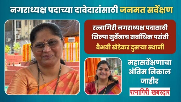 रत्नागिरी, ता. २६ : रत्नागिरीचा भावी नगराध्यक्ष (Ratnagiri Nagaraadhyaksha) कोण होणार? या बहुचर्चित प्रश्नाचा कौल अखेर रत्नागिरीतील नागरिकांनी दिला आहे. कोकणातील सुप्रसिद्ध वृत्तपत्र ‘रत्नागिरी खबरदार’ (Ratnagiri Khabardar) ने घेतलेल्या महासर्वेक्षणाचा अंतिम निकाल आज (दि. २६ ऑक्टोबर) सकाळी १० वाजता जाहीर करण्यात आला असून, यामध्ये नगराध्यक्ष पदासाठी सर्वाधिक पसंती शिल्पा सुर्वे यांना मिळाल्याचे स्पष्ट झाले आहे.