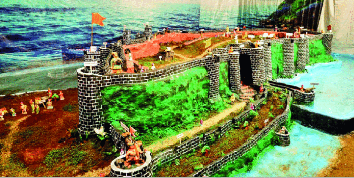 रत्नागिरी : श्री शिवशंभू मित्र मंडळाने यंदाच्या दिवाळी उत्सवानिमित्त शहरातील छत्रपतीनगर, साळवी स्टॉप येथे मराठा आरमाराचा आधारस्तंभ असलेल्या श्री विजयदुर्ग किल्ल्याची भव्य आणि हुबेह्व प्रतिकृती साकारली आहे. तब्बल १५ दिवस रात्रंदिवस मेहनत घेऊन साकारलेला हा ३० फूट लांब, १५ फूट रुंद आणि ४ फूट उंच जलदुर्ग सध्या परिसरातील चर्चेचा आणि आकर्षणाचा विषय ठरला आहे.