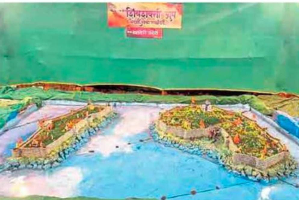 रत्नागिरी : खेडशी येथील शिवशक्ती ग्रुपने खांदेरी-उंदेरी किल्ल्याची प्रतिकृती हुबेहूब साकारली आहे. महाराष्ट्राच्या पराक्रमी इतिहासाचे आणि वैभवशाली दुर्गसंस्कृतीचे दर्शन घडवण्यासाठी अभेद्य ‘जलदुर्ग’ खांदेरी उंदेरी साकारला. छत्रपती शिवाजी महाराजांच्या मराठा आरमाराचे महत्त्वाचे केंद्र असलेल्या आणि अनेक सागरी लढायांचे साक्षीदार ठरलेल्या खांदेरी-उंदेरी किल्ल्याचा हा देखावा रत्नागिरीकरांना आवडला आहे. शिवशक्ती ग्रुपच्या तरुणांनी बारकाईने किल्ल्याचे बांधकाम, तटबंदी आणि ऐतिहासिक महत्त्व विचारात घेऊन ही प्रतिकृती तयार केली आहे. रात्रीच्यावेळी आकर्षक रोषणाईमुळे हा देखावा अधिकच विलोभनीय दिसतो. खेडशीनाका येथील खेडशी हायस्कूलसमोर (मोरेश्वर हॉटेलच्यामागे) ही प्रतिकृती साकारली असून, अनेकजण पाहण्यासाठी येत आहेत.