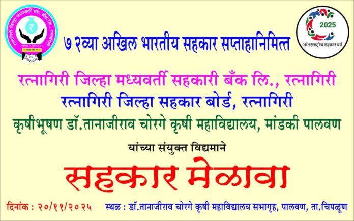 रत्नागिरी : ७२ व्या अखिल भारतीय सहकार सप्ताहानिमित्त (72nd All India Cooperative Week) रत्नागिरी जिल्ह्यात सहकार क्षेत्राला नवी दिशा देण्यासाठी एका भव्य ‘सहकार मेळाव्याचे’ आयोजन करण्यात आले आहे. गुरूवार, दिनांक २० नोव्हेंबर २०२५ रोजी हा मेळावा संपन्न होणार आहे.