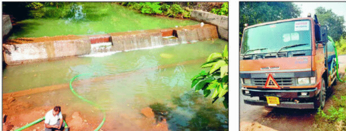 दापोली : दापोली-खेड मार्गाचे डांबरीकरण आणि काँक्रिटीकरणाचे काम सध्या सुरू असून या कामासाठी लागणारे पाणी वाकवली गावातील बंधाऱ्यातून राजरोसपणे नेले जात असल्याचा प्रकार उघडकीस आला आहे. ग्रामस्थांना न विचारता आणि कोणतीही परवानगी न घेता गावातील पाणी वापरल्याने ग्रामस्थांमध्ये संताप व्यक्त होत आहे.