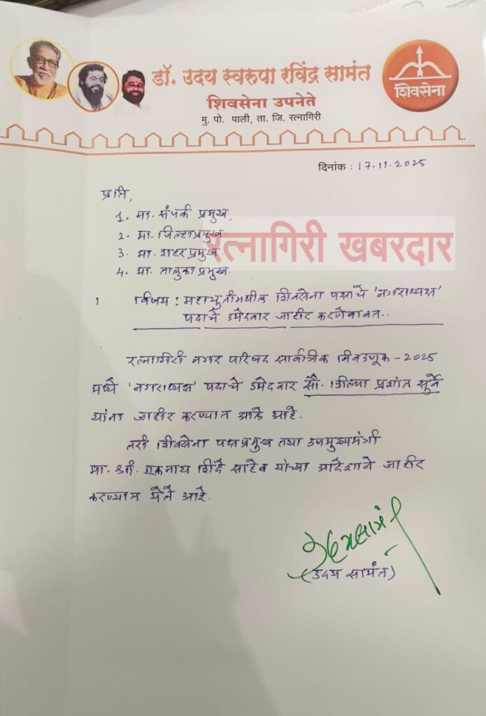 राज्याचे उपमुख्यमंत्री एकनाथ शिंदे (Eknath Shinde) आणि जिल्ह्याचे पालकमंत्री उदय सामंत (Uday Samant) यांच्या सूचनेनुसार, आज रात्री उशिरा ही महत्त्वपूर्ण घोषणा करण्यात आली. उमेदवारी अर्ज भरण्यासाठी उद्या (सोमवार, १७ नोव्हेंबर) हा शेवटचा दिवस असल्याने या घोषणेकडे संपूर्ण जिल्ह्याचे लक्ष लागले होते.