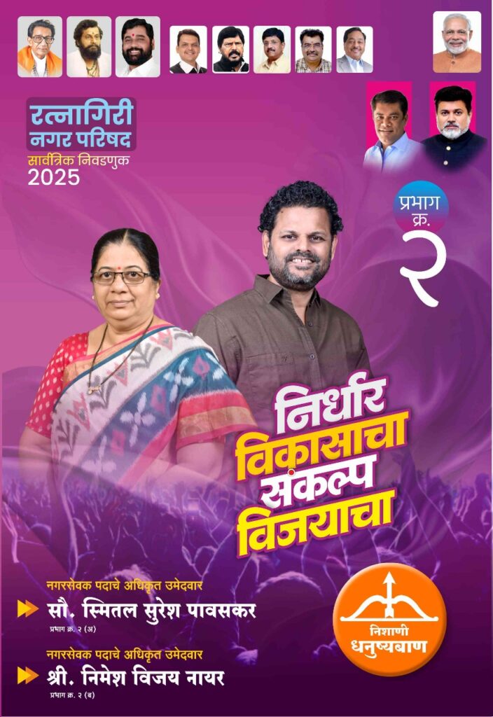 रत्नागिरी : रत्नागिरी नगरपालिकेच्या सार्वत्रिक निवडणुकीची रणधुमाळी शिगेला पोहोचली असून, प्रभाग क्रमांक २ मध्ये महायुतीचे उमेदवार निमेश नायर (Nimesh Nair) आणि सौ. स्मितल पावसकर (Smital Pavaskar) यांनी प्रचारात मोठी आघाडी घेतली आहे. मागील कार्यकाळात केलेली भरीव विकासकामे आणि मतदारांशी असलेला दांडगा जनसंपर्क यामुळे या दोन्ही उमेदवारांचा विजय निश्चित मानला जात आहे.