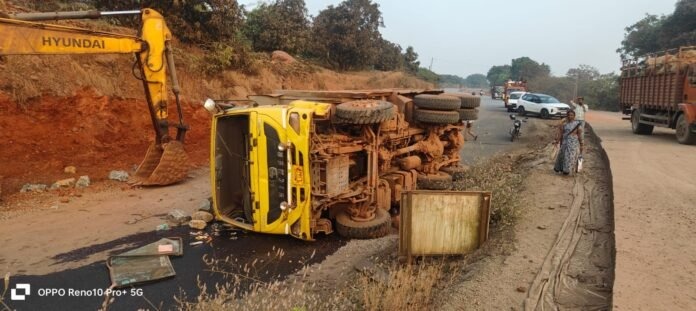 रत्नागिरी : हातखंबा येथे महामार्गावर सलग दुसऱ्या दिवशी अपघात झाला. हातखंबा पीर येथे उतारात डंपर उलटून अपघात झाला.