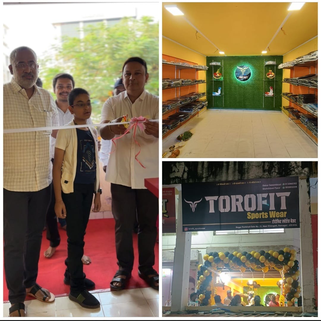 स्टाईल, कम्फर्ट आणि परफॉर्मन्स यांचा परफेक्ट कॉम्बो म्हणजेच टोरोफिट स्पोर्ट्स वेअर! स्वा. सावरकर नाट्यगृहाच्या शेजारील नगर परिषदेच्या गाळ्यात हे फिटनेस आणि स्टाईलचे नवे दालन शुक्रवारी २८ नोव्हेंबर रोजी सुरू झाले आहे. रत्नागिरीचे पालकमंत्री तथा राज्याचे उद्योग मंत्री ना. उदय सामंत यांचे स्वीय सहाय्यक श्री. महेश सामंत आणि रत्नागिरीतील प्रतिथयश कर सल्लागार श्री. राजेश सोहनी यांच्या हस्ते टोरोफिट स्पोर्ट्स वेअर या नव्या दालनाचा शुभारंभ करण्यात आला.