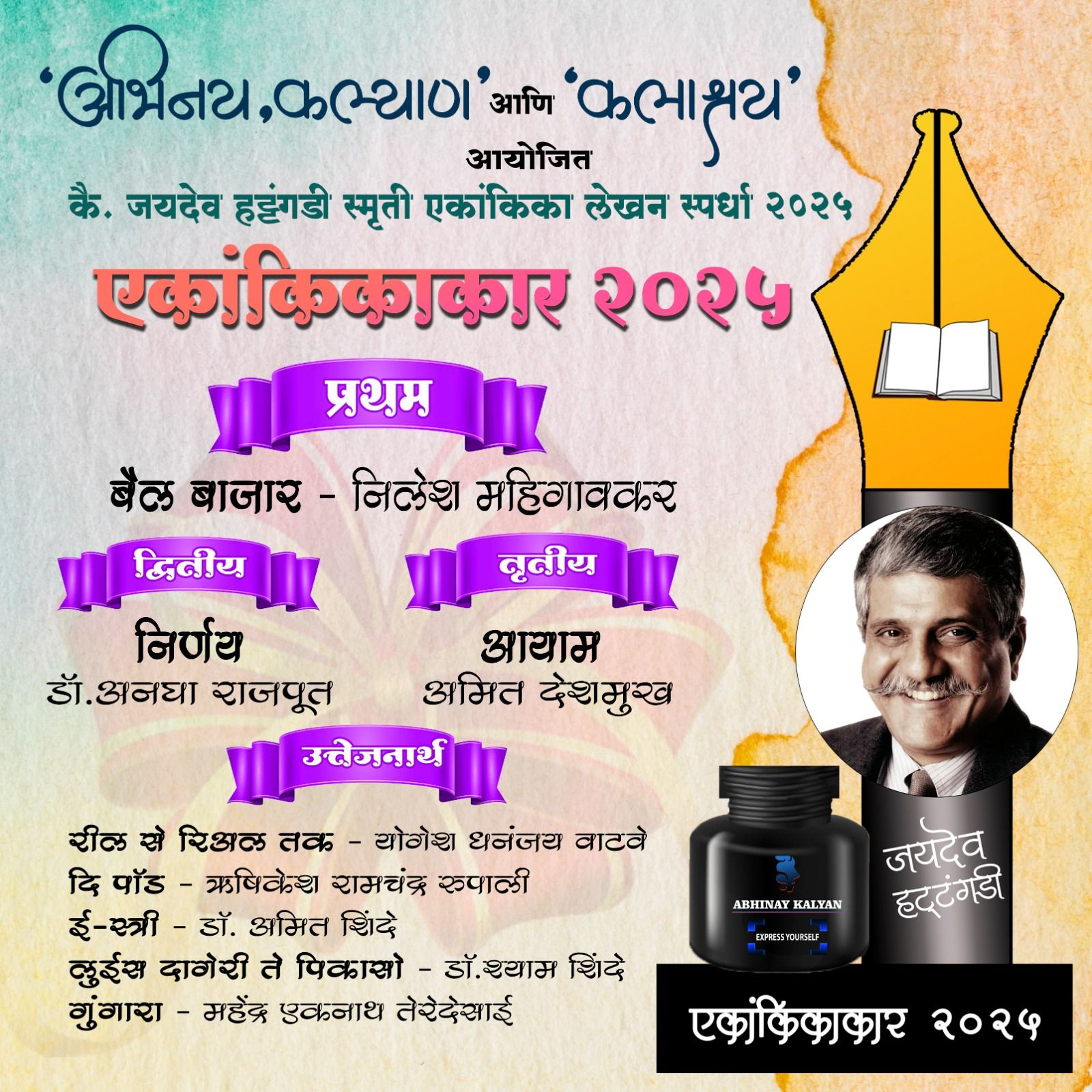 खेड : कलाश्रय आणि अभिनय, कल्याण यांच्या संयुक्त विद्यमाने आयोजित जयदेव हटंगडी स्मृती एकांकिका लेखन स्पर्धा ‘एकांकिकाकार २०२५’ चा निकाल नुकताच जाहीर झाला. महाराष्ट्रासह देश-विदेशातून मोठ्या प्रमाणावर मिळालेल्या प्रतिसादामुळे यंदा तब्बल ९५ नव्या एकांकिका स्पर्धेसाठी प्राप्त झाल्या आहेत.