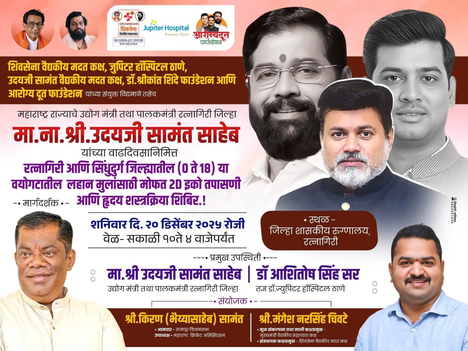 या शिबिराला खुद्द पालकमंत्री उदय सामंत आणि आमदार किरण सामंत उपस्थित राहणार आहेत. तरी रत्नागिरी आणि सिंधुदुर्ग जिल्ह्यातील गरजू पालकांनी आपल्या मुलांच्या हृदयाशी संबंधित काहीही तक्रार असल्यास, या मोफत शिबिराचा लाभ घ्यावा, असे आवाहन आयोजकांनी केले आहे.