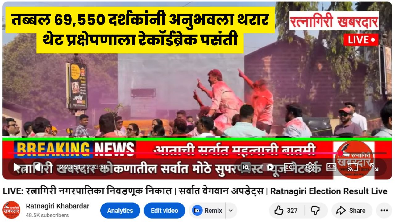 आज सकाळी १० वाजता मतमोजणीला सुरुवात झाली असली, तरी ‘रत्नागिरी खबरदार’ने सकाळी ९ वाजल्यापासूनच थेट प्रक्षेपणाला सुरुवात केली होती. दुपारी १२ वाजेपर्यंत चाललेल्या या लाईव्ह कव्हरेजमध्ये प्रत्येक फेरीचा निकाल सर्वात आधी प्रेक्षकांपर्यंत पोहोचवण्यात आला. त्यामुळेच युट्यूब चॅनेलवर प्रेक्षकांची अक्षरशः झुंबड उडाली होती.