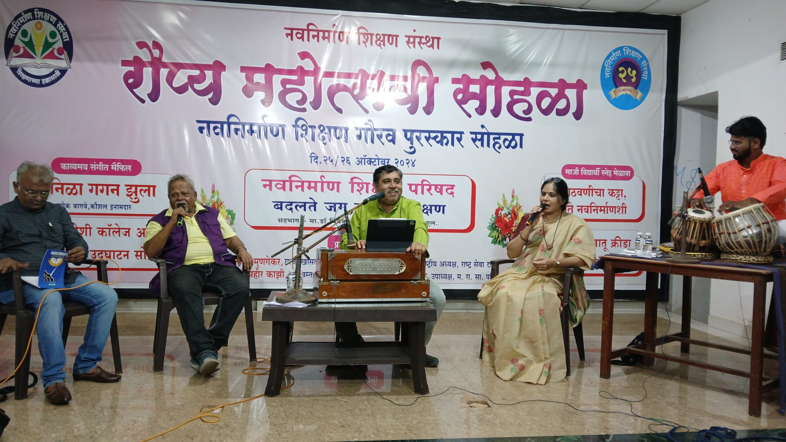 नवनिर्माण शिक्षण संस्थेच्या रौप्य महोत्सवी वर्षानिमित्त २५ आणि २६ ऑक्टोबर रोजी विविध कार्यक्रमांचे आयोजन करण्यात आले आहे. यात पहिल्या दिवशीच्या सायंकाळच्या सत्रात ‘गर्द निळा गगन झुला’ ही बहारदार मैफल ज्येष्ठ कवी अशोक बागवे आणि संगीतकार कौशल इनामदार यांनी रंगवली. यावेळी सुबोध चित्ते आणि अस्मिता पांडे यांनी या द्वयींशी संवाद साधत त्यांचा सांगीतिक प्रवास रसिक श्रोत्यांसमोर उलगडला.