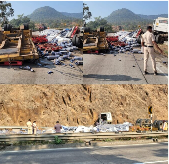 खेड : मुंबई-गोवा राष्ट्रीय महामार्गावरील कशेडी घाट परिसरात बुधवारी सकाळी कोल्ड्रिंक्सच्या बाटल्यांची वाहतूक करणारा कंटेनर पलटी झाल्याने महामार्गावरील एक लेन पूर्णपणे बंद झाली अपघातात कोणतीही जीवितहानी झालेली नसल्याची माहिती पोलिसांनी दिली आहे. मिळालेल्या वृत्तानुसार, कंटेनर चालक राम आचल मिंद (रा. उत्तर प्रदेश) हे एमएच ४३ जीई २२४४ या क्रमांकाच्या कंटेनरने लोटे येथून भिवंडी-वाडा दिशेने जात होते. कशेडी घाटातील पोलादपूरजवळील चोळई गावाजवळ पोहोचताच चालकाचा वाहनावरील ताबा सुटल्याने कंटेनर रस्त्याच्या मधोमध पलटी झाला.