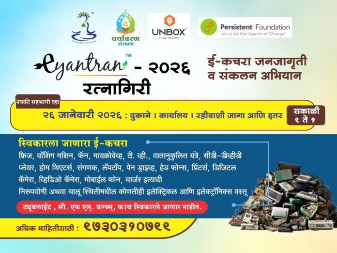 रत्नागिरी : गेल्या वर्षीप्रमाणेच यंदाही प्रजासत्ताकदिनी रत्नागिरी शहरात ई-यंत्रण अर्थात इलेक्ट्रॉनिक कचऱ्याच्या संकलनाचा मोठा उपक्रम राबवला जाणार आहे. रत्नागिरीतील अनबॉक्स युवर डिझायर आणि पुण्यातील पूर्णम इकोव्हिजन फाउंडेशन यांच्या संयुक्त विद्यमाने याचे आयोजन करण्यात आले आहे.