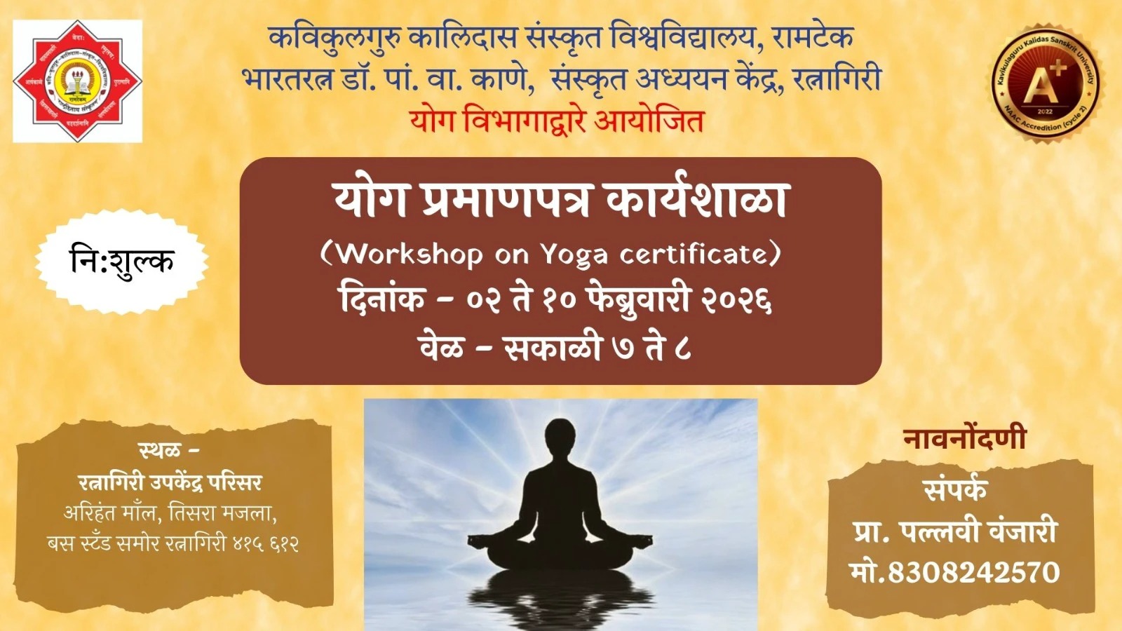 रत्नागिरी: धावपळीच्या जीवनशैलीत आरोग्य जपण्यासाठी आणि शारीरिक-मानसिक प्रसन्नतेसाठी रत्नागिरीत विशेष योग कार्यशाळेचे आयोजन करण्यात आले आहे. कविकुलगुरू कालिदास संस्कृत विश्वविद्यालयाच्या भारतरत्न डॉ. पां. वा. काणे संस्कृत अध्ययन केंद्र (रत्नागिरी उपकेंद्र) आणि योग विभागामार्फत ही नि:शुल्क योग प्रमाणपत्र कार्यशाळा पार पडणार आहे.