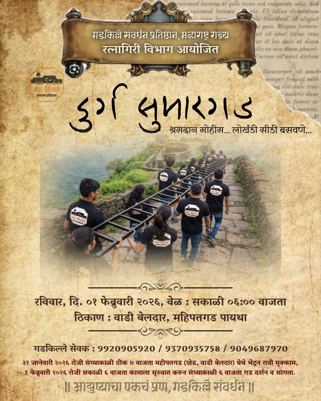 रत्नागिरी : किल्ले सुमारगडवरील (ता. खेड) कोसळली लोखंडी शिडी पुन्हा बसविण्यासाठी गडकिल्ले संवर्धन प्रतिष्ठानच्या रत्नागिरी विभागामार्फत १ फेब्रुवारी रोजी श्रमदान मोहीम राबविली जाणार आहे. या मोहिमेत सहभागी होऊ इच्छिणाऱ्या मावळ्यांनी ३१ जानेवारी रोजी संध्याकाळी ७ वाजेपर्यंत किल्ले महिपतगड (वाडी बेलदार) पायथा येथे एकत्र जमायचे आहे. रात्री ८:३० वाजता सर्वांसाठी जेवणाची व्यवस्था करण्यात येईल.