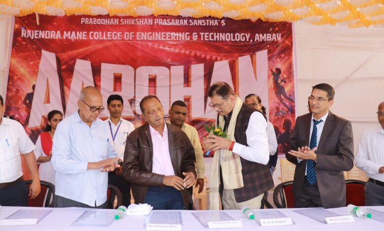 देवरूख : येथील प्र. शि. संस्थेच्या राजेंद्र माने अभियांत्रिकी महाविद्यालयाच्या २८ व्या वार्षिक स्नेहसंमेलन “आरोहण 2के26” चे उद्घाटन संपन्न झाले. आंतरमहाविद्यालयीन कला, क्रीडा व सांस्कृतिक स्पर्धांचा समावेश असलेल्या या महोत्सवाच्या उद्घाटन समारंभाला अॅडलर हेल्थकेअर देवरुखचे बिझनेस डेव्हलपमेंट जनरल मॅनेजर श्री. मंगेश प्रभुदेसाई प्रमुख पाहुणे म्हणून आमंत्रित होते.