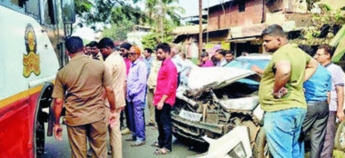 चिपळूण : शहरातील बुरुमतळी परिसरात सोमवारी दुपारी ३ वाजण्याच्या सुमारास एसटी बस आणि क्रेटा कार यांच्यात अपघात झाला. पाग परिसराकडून येणाऱ्या हडकणी-चिपळूण एसटी बसने समोरून धडक देत क्रेटा कारला काही अंतर फरफटत नेले. यामध्ये कारचे मोठे नुकसान झाले.