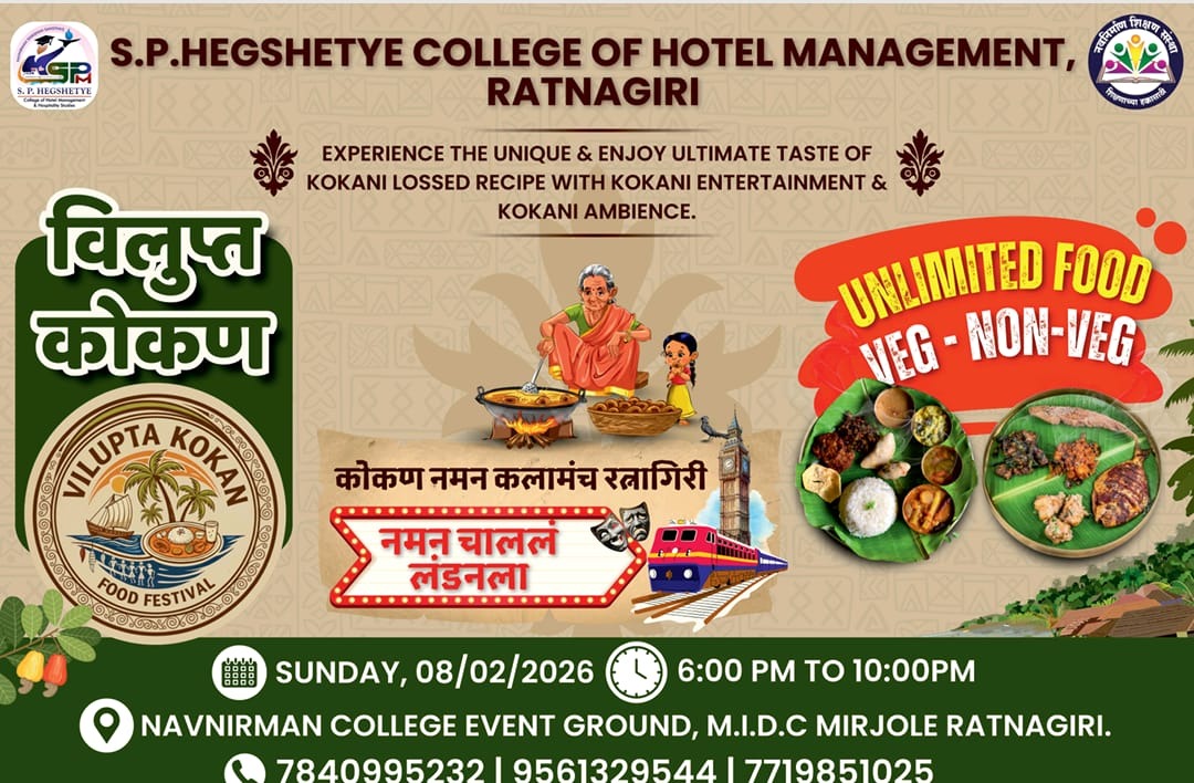 रत्नागिरी: कोकणची संस्कृती, तिथल्या कला आणि प्रामुख्याने जिभेवर रेंगाळणारी चव जपणे हे आजच्या काळात एक आव्हान बनले आहे. हीच परंपरा जपण्यासाठी रत्नागिरीतील नवनिर्माण शिक्षण संस्थेच्या एस. पी. हेगशेट्ये महाविद्यालयाने एक स्तुत्य उपक्रम हाती घेतला आहे. महाविद्यालयाच्या बी. एस. सी. हॉस्पिटॅलिटी स्टडिज (हॉटेल मॅनेजमेंट) विभागातर्फे रविवार, ०८ फेब्रुवारी २०२६ रोजी “विलुप्त कोकण” या विशेष थीम डिनरचे आयोजन करण्यात आले आहे.