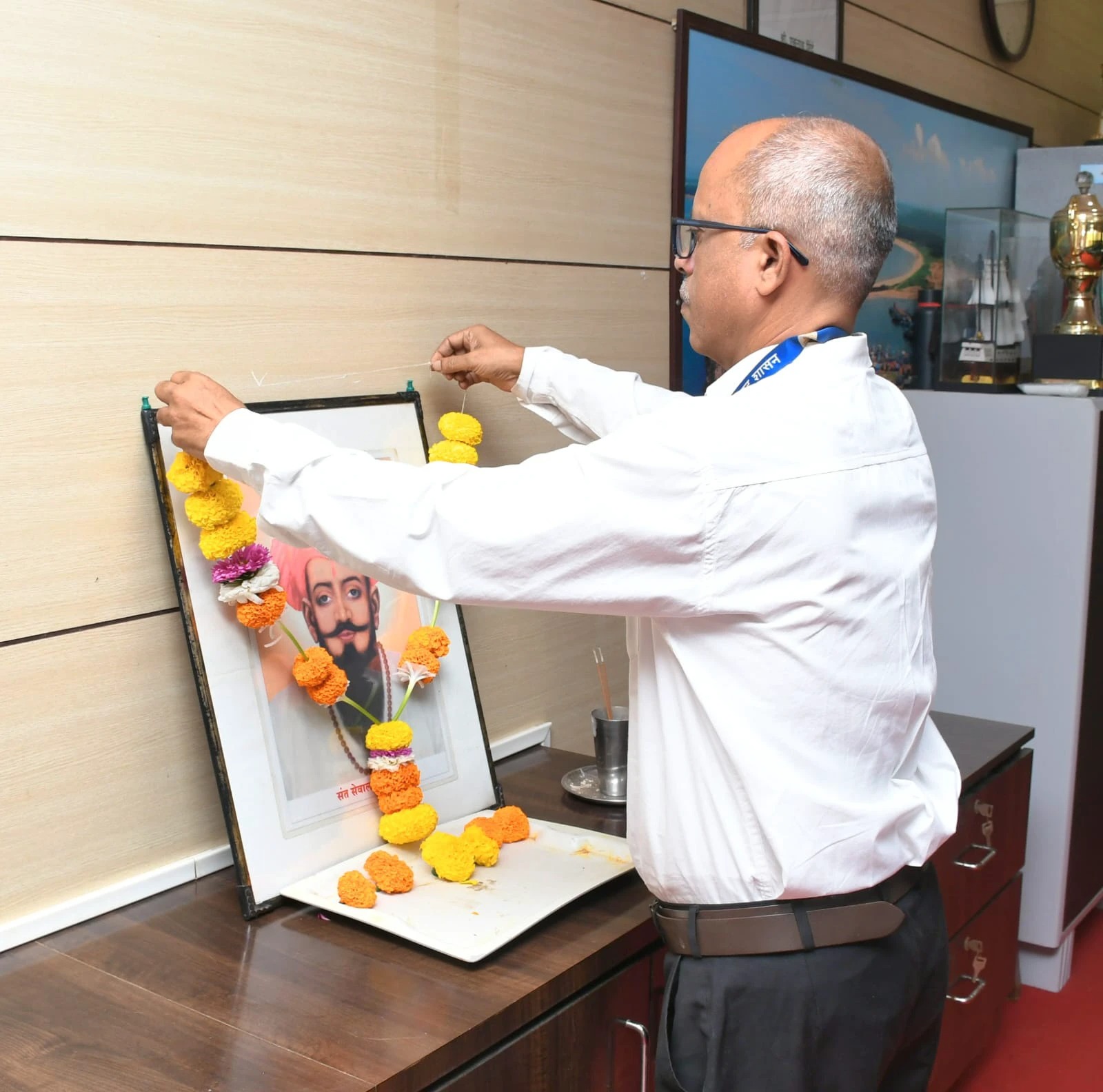 - अभिवादन: महाविद्यालयाचे प्राचार्य डॉ. केतन चौधरी यांनी महाराजांच्या प्रतिमेस पुष्पहार अर्पण केला.