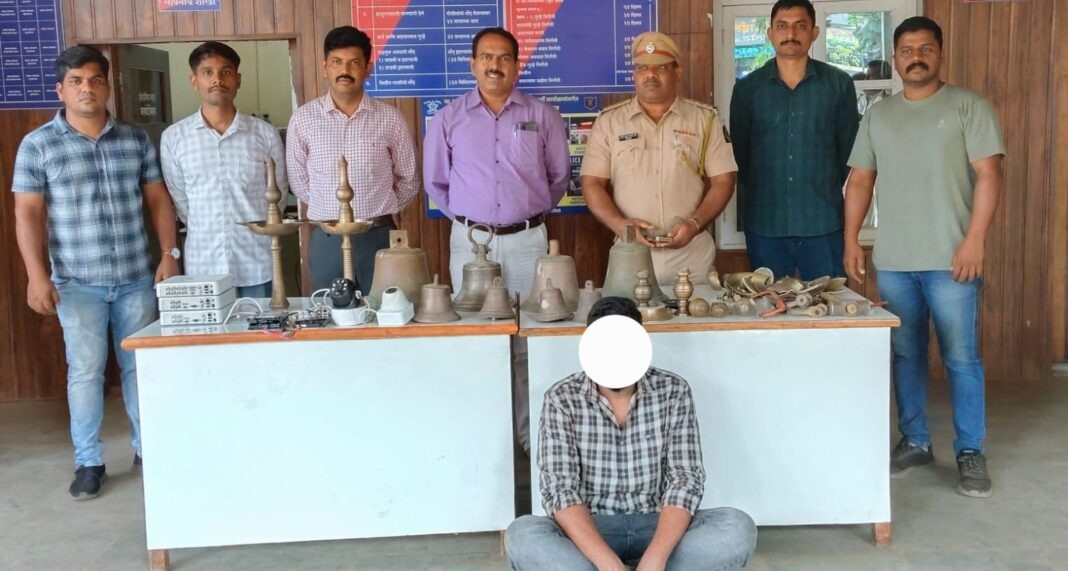 पोलिसांनी दिलेल्या माहितीनुसार, अटक करण्यात आलेल्या या भामट्याकडून पोलिसांनी ६ लाख ५५ हजार ६०० रुपये किमतीचा ऐवजी हस्तगत केला आहे. यामध्ये प्रामुख्याने मंदिरांमधील जड पितळी घंटा आणि सीसीटीव्हीचे साहित्य यांचा समावेश आहे. आरोपीने रत्नागिरीतील खेड, दाभोळ, दापोली, मंडणगड, बाणकोट आणि रायगडमधील महाड, पोलादपूर या भागांतील मंदिरांमध्ये चोऱ्या केल्याची कबुली दिली आहे.