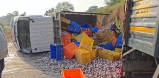 गुहागर-चिपळूण मार्गावर मच्छी वाहतूक करणारा टेम्पो उलटला
