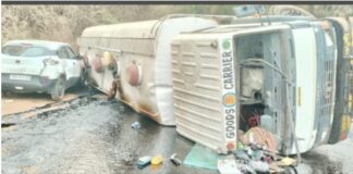 आंजणारी घाटात केमिकल वाहतूक करणारा टँकर पलटी